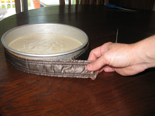 I love these things. You soak them in water and then affix them to the outside of the cake before baking (see pic below). They come in large and small sizes.